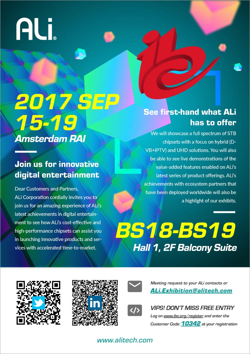 Dear Customers and Partners, ALi Corporation cordially invites you to join us for an amazing experience of ALi’s latest achievements in digital entertainment at IBC 2016 on September 9-13 in Amsterdam, the Netherlands. Visit us at our balcony suites BM19 & 20 (Hall 1, 2F) to see how ALi’s cost-effective and high-performance chipsets can assist you in launching innovative products and services with accelerated time-to-market.